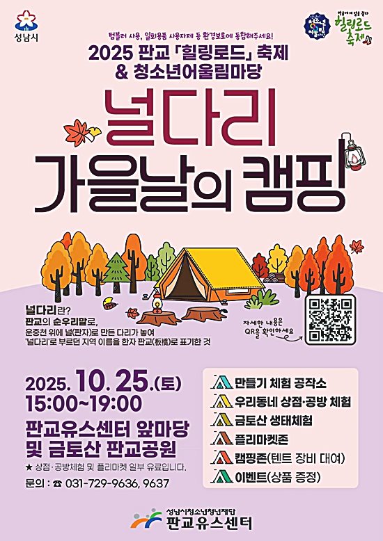 성남시청소년청년재단(대표이사 양경석) 판교유스센터는 10월 25일, 오후 3시부터 7시에 판교유스센터 앞마당 및 판교공원에서 ‘판교 힐링로드 축제와 청소년어울림마당’ 을 개최한다.이번 행사는 “널다리 가을날의 캠핑”을 주제로 청..