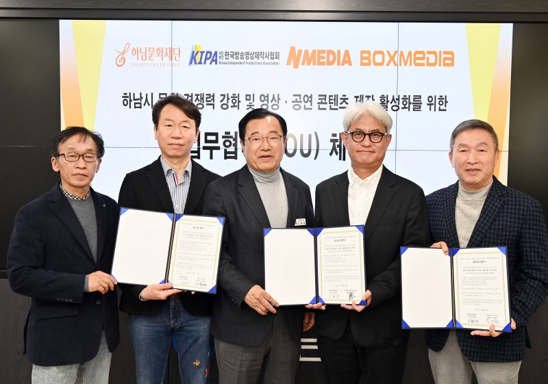 ▲하남문화재단(이사장 이현재)이 4월 7일(화) (사)한국방송영상제작사협회(KIPA)(협회장 황태준), ㈜앤미디어(대표 강동길), ㈜박스미디어(대표 박해선)와 각각 업무협약(MOU...