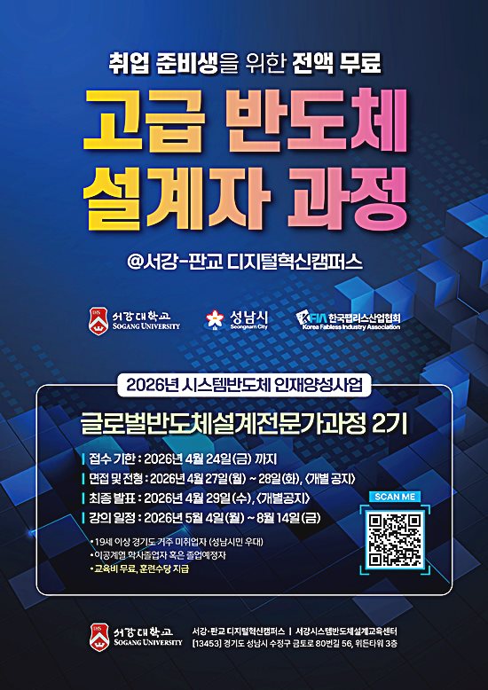 - 가천대·서강대·한국폴리텍대에서 운영…전액 무료·훈련수당 지원 성남시(시장 신상진)는 반도체 설계 분야 실무형 인재를 육성하기 위한 ‘성남시 시스템반도체 아카데미’ 교육생을...