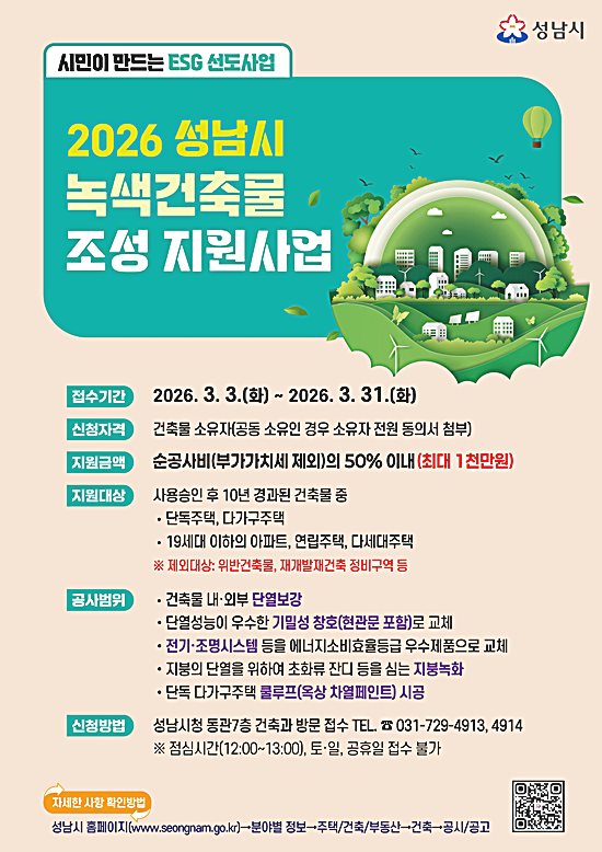- 3월 31일까지 접수… 2026년 녹색건축물 조성 지원사업 시행 성남시(시장 신상진)는 노..